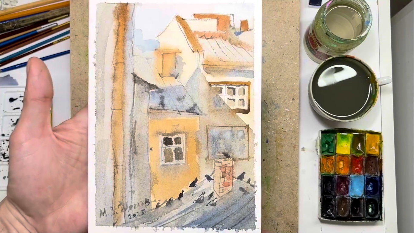 Проверяем свет и тени, прописываем элементы архитектуры. Завершаем картину. Говорим о особенностях финала в акварели